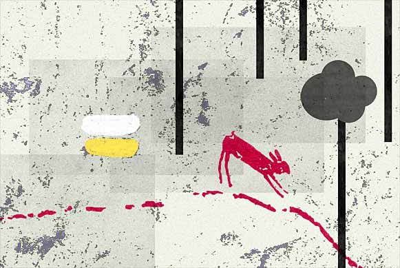 Todo se mueve excepto mi sendero. Para las plantas he usado un pincel japonés. La liebre es una pintura del conjunto rupestre de Torcal de las Bojadillas, cerca de Nerpio.